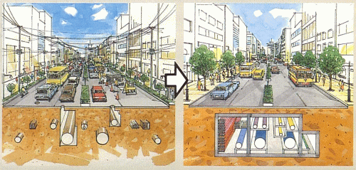 主要負責將市區架空的電力、通訊、有線電視、道路照明等電纜收容至埋地的管道。一般設置在道路的人行道下面,其埋深較淺,一般在1.5米左右。以矩形斷面較為常見,一般不要求設置工作通道及照明、通風等設備,僅增設供維修時用的工作手孔即可。
